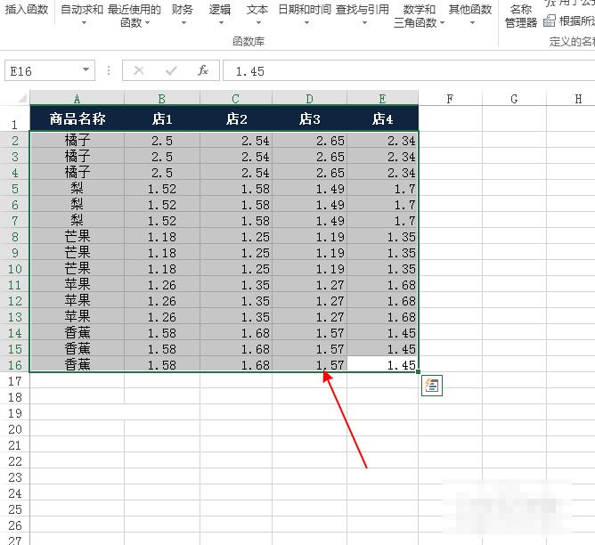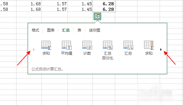 5、鼠标移动到相应的函数图标上,在数据表格中可以直接显示出结果。为我们提供了很多常用的函数功能,再也不用查找函数了。