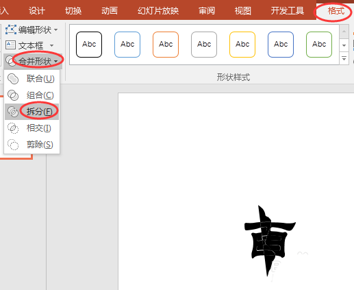5、手指按住【shift】键,鼠标先点击文字,再点击绘制的曲线,选择【格式】选项卡【合并形状】中的【拆分】