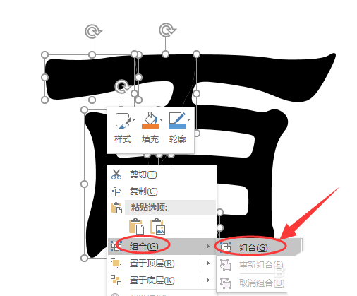 7、再次按住【shift】键,选中【百】字左半边,鼠标右击选择【组合】-【组合】