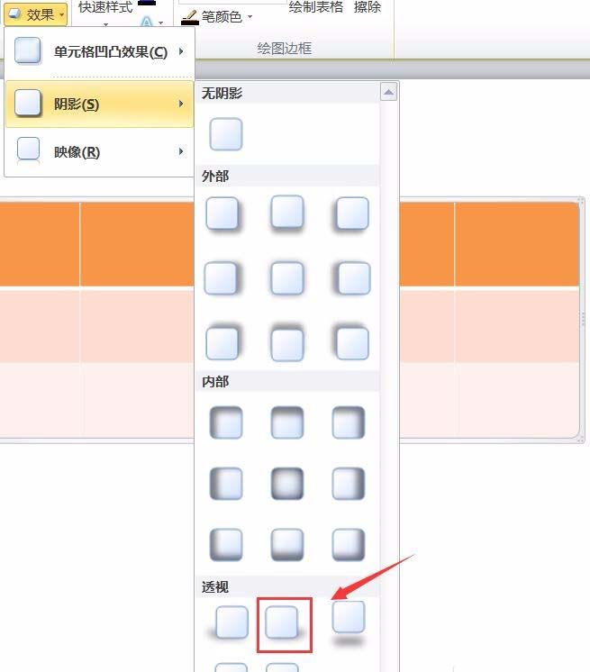 7、点击效果选项在其下拉菜单里找到阴影选项,点击阴影选项在其下拉菜单那里找到透视选项,在透视里选择一种透视效果,如图所示: