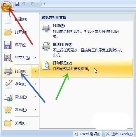 2、点击左上角的“Office 按钮”(图中红色箭头所指),在弹出菜单中将鼠标指针移至“打印”(图中蓝色箭头所指),在弹出菜单中点击“打印预览”(图中绿色箭头所指)
