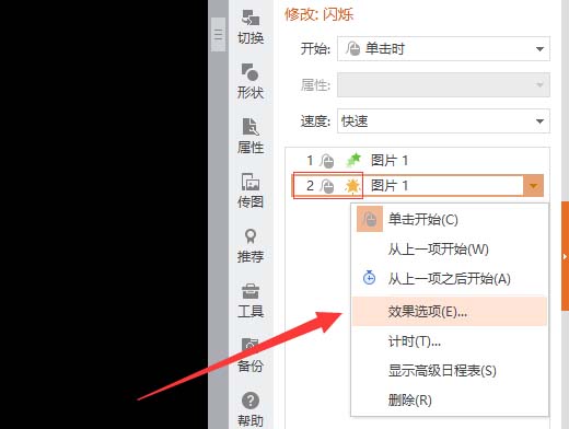 4、设置完成,在动画的对应效果名称处右键----效果选项