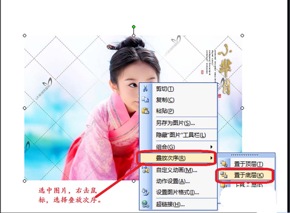 1、设置图片和文字的关系。选中图片,右击鼠标,在弹出项里选择“叠放次序——置于底层”。