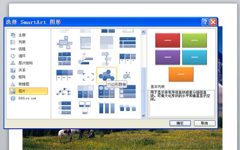3、切换到图片选项卡,选择六边形群集,点击确定按钮,查看效果。