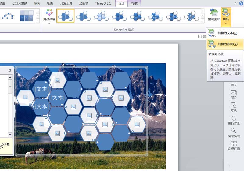 5、选择六边形群集,执行设计-转换-转换为形状命令,将其转换成一个图形。