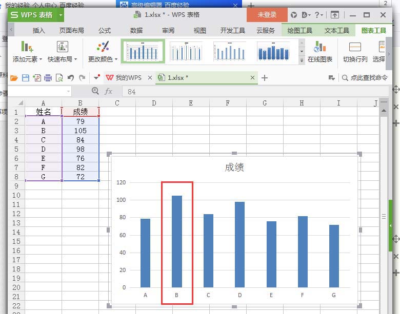 4、这里我们选择一个数据更改,选B这个数据,本来是65.我们现在把它改成105,这样方便看出不同。在Excel中是立刻改变的。