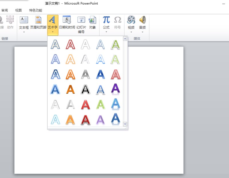 1、首先打开我们的PPT软件。然后新建一个空白的版式页面,在空白的版式页面里面,我们插入艺术字。然后在艺术字里面输入百度经验四个字。进行演示操作,当然,你需要什么文字就进行输入什么文字。