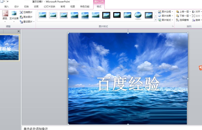 5、然后我们把这张剪切画不就粘贴到我们的第一张PPT里面。把剪切画放在图片的上面使我们的海水可以遮挡住文字一半,这样我们的百度经验就用一种要石沉大海的感觉,在文字里面我们可以修改年终总结或者其他的文字。这样 年终总结的封面图就基本制作完成。