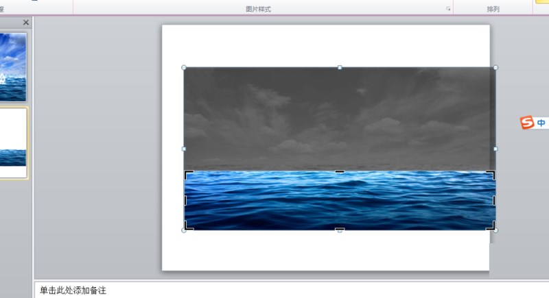 4、现在那我们以这张图片作为背景。我们在插入一张剪切型的图片。先进行新建一个空白版式的页面。在空白的页面里面插入同一张图片。然后点击图片,再绘图工具里面找到一个剪切。把这张图片剪切只留下海水。剪切完成以后我们再插入一个波浪形状。这样这张剪切画就基本制作完成。