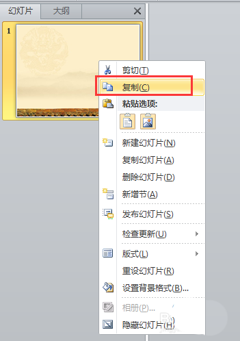 6、然后就在左边幻灯片处,右键复制第一张幻灯片。