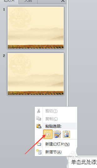 7、然后在第一张幻灯片下方右键粘贴即可。