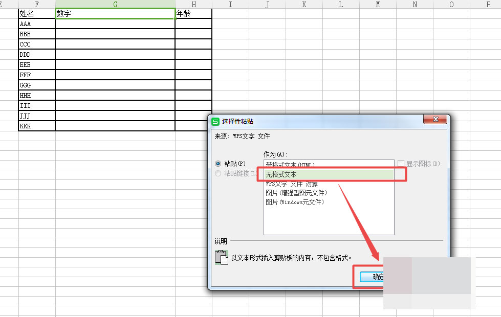 6、在选择性粘贴当中选择无格式文本,然后确定。如图。