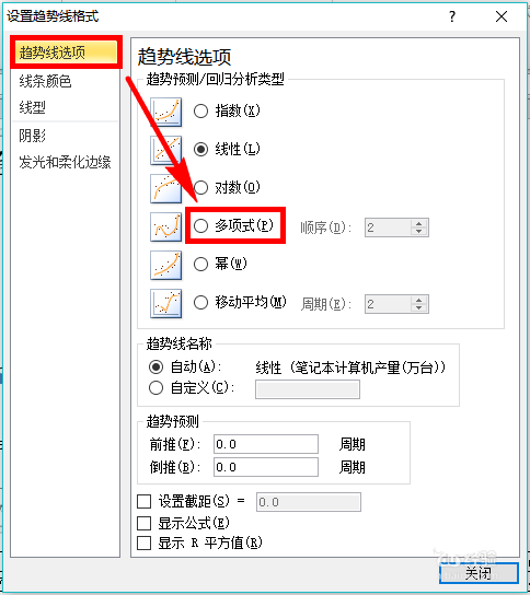 3、进入趋势线设置页面。这时就进入到了趋势线的设置页面了,进入页面后首先看到的就是【趋势线选项】的设置,在图示右侧区域提供了很多种线性回归分析类型,选择你需要的类型。比如,小编在这里选的就是【多项式】回归类型。