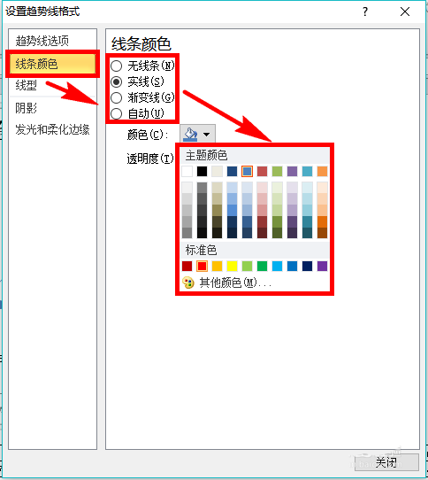 4、线条颜色设置。设置好限行回归的类型之后,点击设置页面左侧菜单栏中的【线条颜色】选项,对回归线的线条属性进行设置。线条属性有无线条、实线等多种类型,这里就根据自己的需要选择就行了。点击图示位置的油漆桶图标后,在其下方就会出现很多的色块,点击相应颜色的色块就能将趋势线设置成相应的颜色。