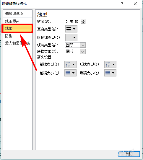 5、线型设置。设置好线条颜色之后,在左侧的菜单中点击【线型】选项,然后在右侧的页面中可以对线条的粗细、单线条或者双线条、短划线的类型等进行设置。