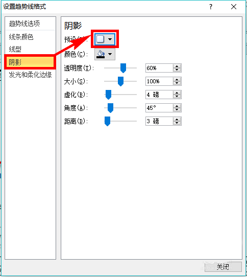6、阴影设置。设置好趋势线的线型之后,在左侧的项目栏中点击阴影,然后在右侧区域中点击【预设】后的下拉箭头,这样可以看到有很多的预设选项,我们可以随意选择。我们也可以点击【颜色】后方的下拉箭头,在这里我们可以对阴影的颜色进行设置。如果需要对阴影的透明度和大小进行设置的话,可以调整图示右侧区域的滑块。