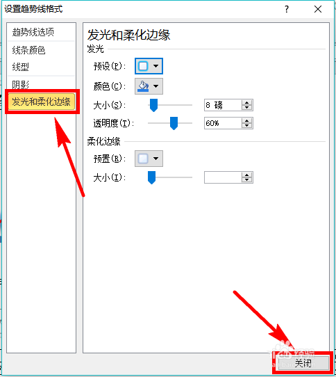 7、发光和柔化边缘设置。依然是点击左侧项目栏中的【发光和柔化边缘】,在右侧的区域中可以完成对发光颜色、大小和透明度等进行设置,设置好之后,点击页面右下角的【关闭】按钮。