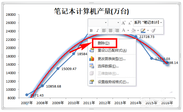 如果要删除趋势线的话,再点击鼠标左键选中趋势线,然后点击鼠标右键,在右键菜单中点击【删除】选项,这样趋势线就可以被删除了。