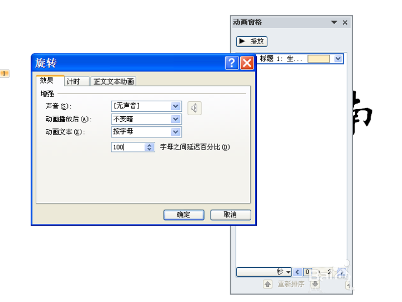 4、在旋转对话框中,设置效果选项卡中的动画文本为按字母,字母间的延迟百分比为100.