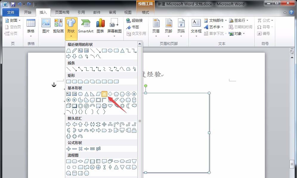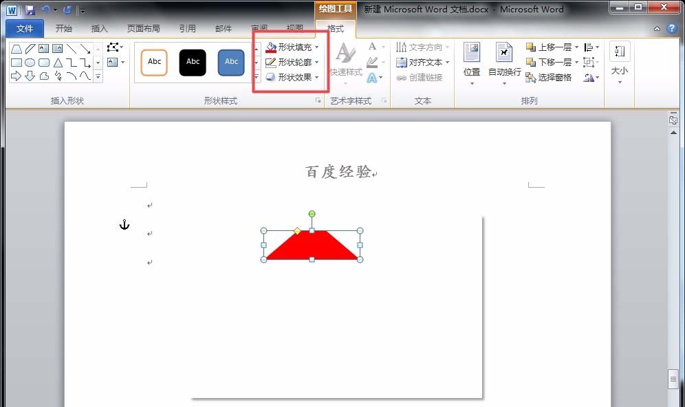 3、下面,点击“插入”菜单下的“形状”-“梯形”,绘制出一个梯形,并用鼠标调整其斜边角度,以及填充颜色。