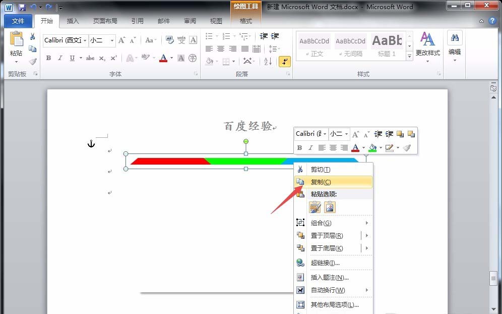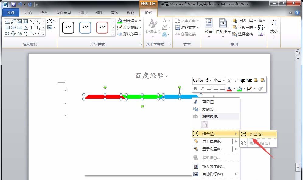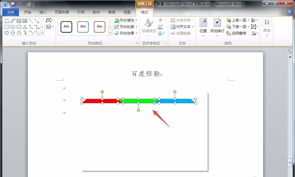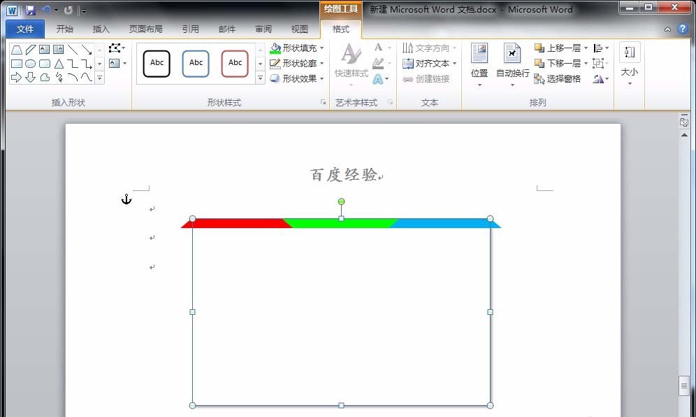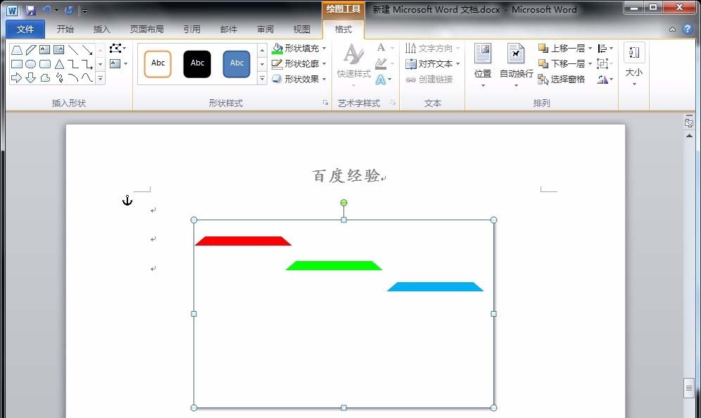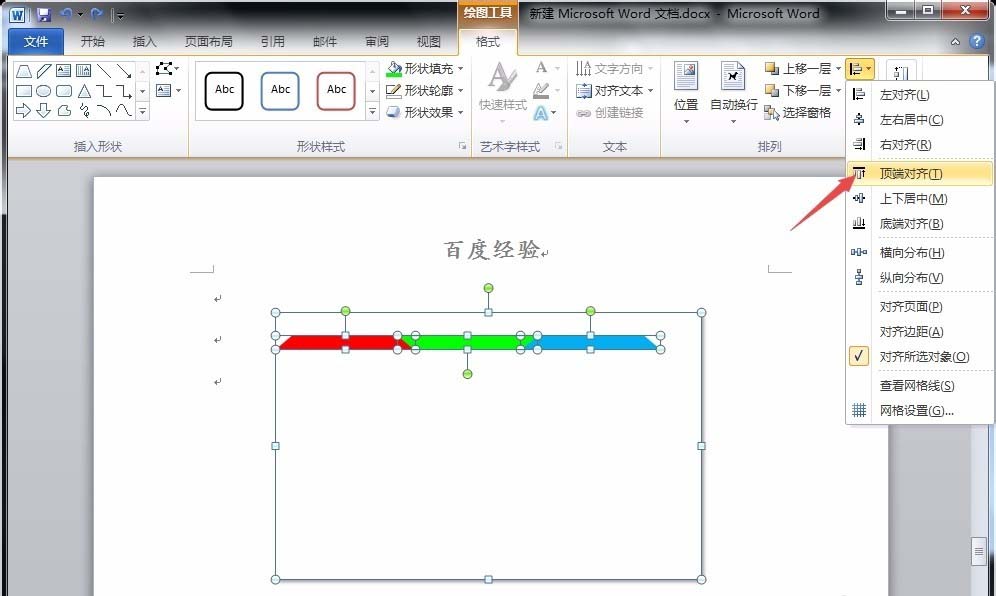 4、将这个提醒复制三个,分别填充为绿色和蓝色,并将绿色旋转180度,与红色和蓝色梯形相契合;同时将三个梯形和矩形都选中,点击“格式”菜单下的“顶端对齐”选项,并把三个梯形组合。