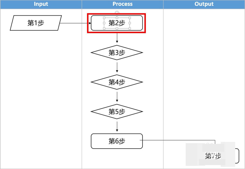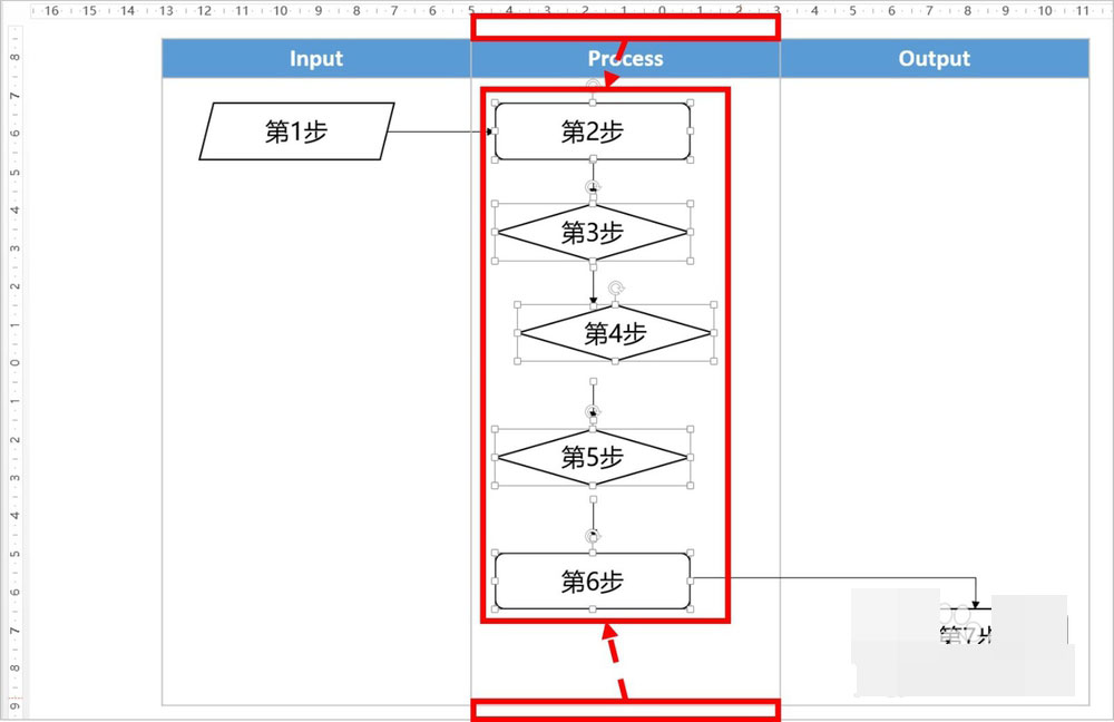 在对齐、调整间距后,我们还要将这些对象批量移动到表格的中间位置(Process下方)。