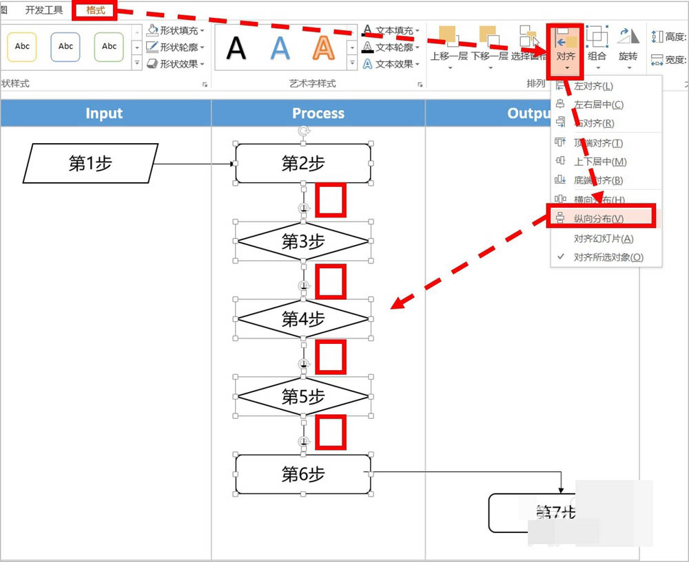 需要注意的是:这里的相同间距,不仅是各个图形之间的间距相同,而是所有被选中的对象之间的间距相同(包括箭头)。