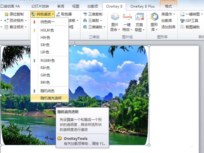 4、删除原来的五张图片,执行onekey菜单,选择颜色组中的纯色递进,从下一级菜单中选择随机填充透明。