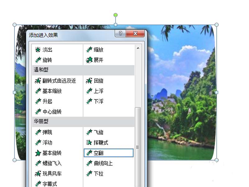 5、执行动画-添加动画-更多进入动画命令,选择空翻动画,调出动画窗格。