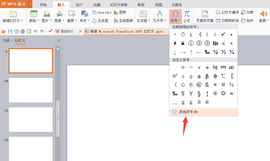 3、在“符号”子菜单的下拉菜单内,如图中红色箭头所示,点击“其他符号”。弹出选择框。