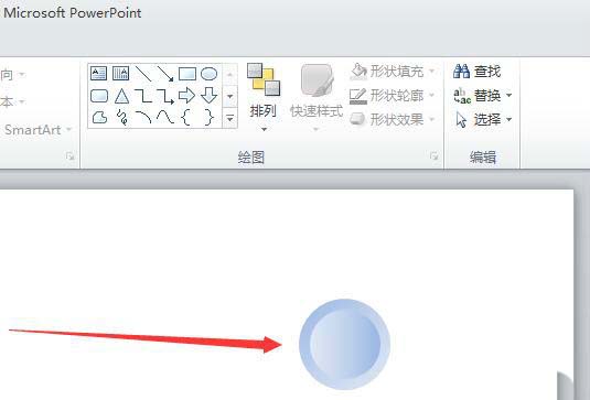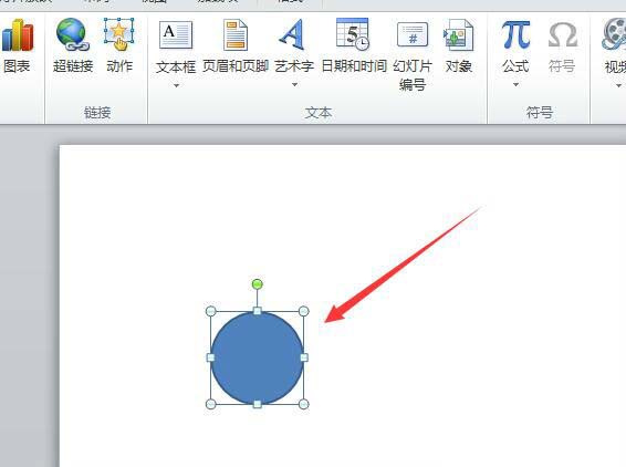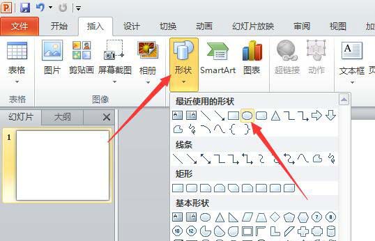 1、首先,打开PPT2010,点击插入选项卡,再点击功能区上的形状,选择圆形。