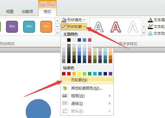 3、在功能区中点击形状轮廓,在弹出的项目中选择无轮廓,将圆形的轮廓线去掉。