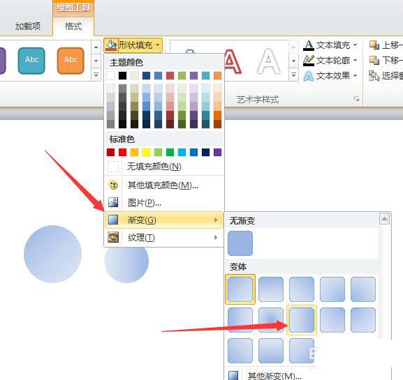 6、接下来再点击形状填充,指定渐变,选择如图所示第二行第三个渐变色。