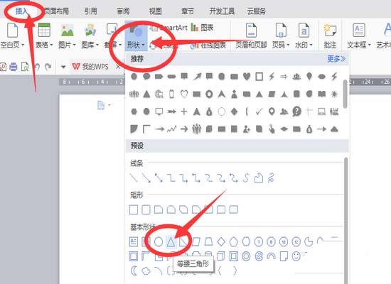 2、在新建文档中,我们点击上方菜单栏中的【插入】,在下方的快捷栏中点击【形状】,在出现的下拉菜单中,找到【基本形状】,点击【等腰三角形】。如下图所示。