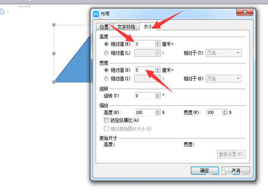 5、在跳出的【布局】对话框中,我们点击【大小】选择卡,在此选项卡中,我们在【高度】下面的绝对值中,输入数字3,代表这个三角形的高度会是3厘米,同样,下方的宽度,在绝对值中输入5。如下图。然后点击【确定】按钮。