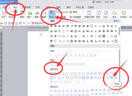2、在新建文档中,我们点击上方菜单栏中的【插入】,在下方的快捷栏中点击【形状】,在出现的下拉菜单中,找到【基本形状】,点击【闪电形】。如下图所示。