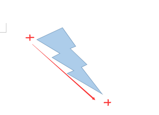 3、点击【闪电形状】之后,将鼠标移动至文档界面,这时鼠标会变成【十】十字形态,按住鼠标左键,在文档页面从左上角向右下角45度位置拉到鼠标,画出一个闪电的形状,如下图。