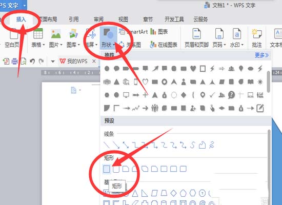10、我们再次按照上面的第二步,点击【插入】——【形状】——【矩形】,点击矩形图形。