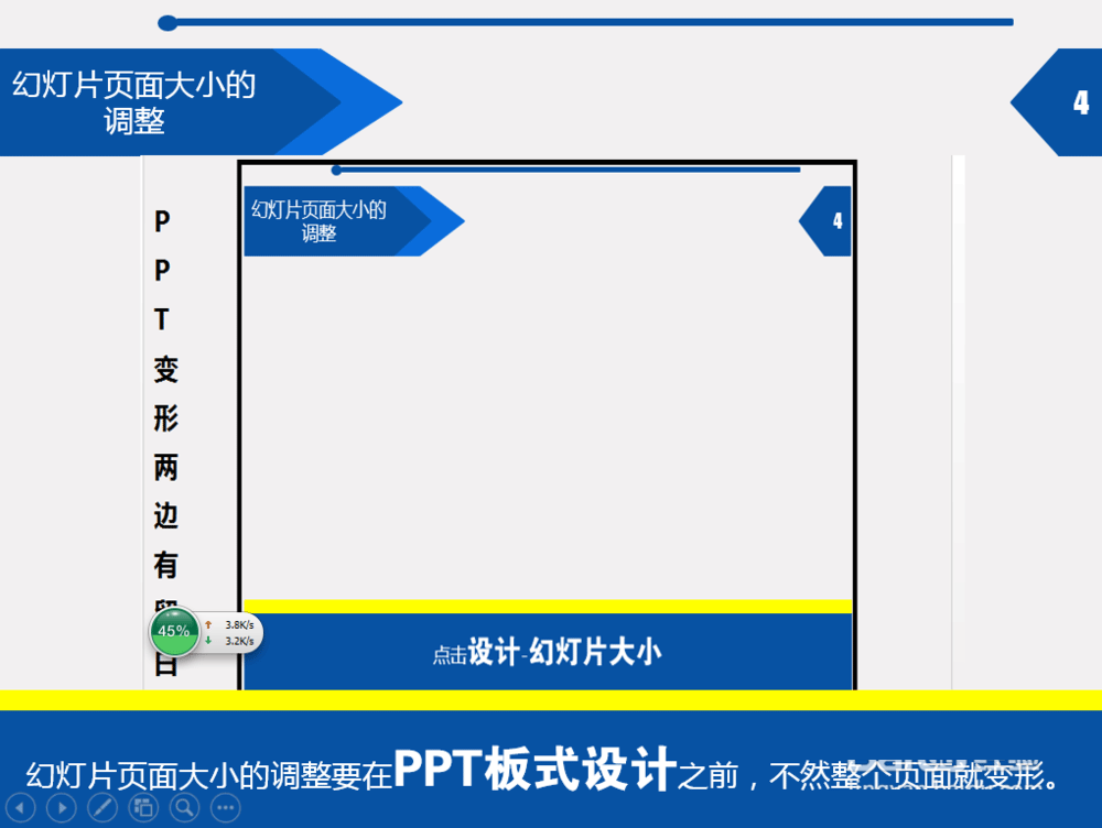 幻灯片页面大小的调整要在PPT板式设计之前,不然整个页面就变形。