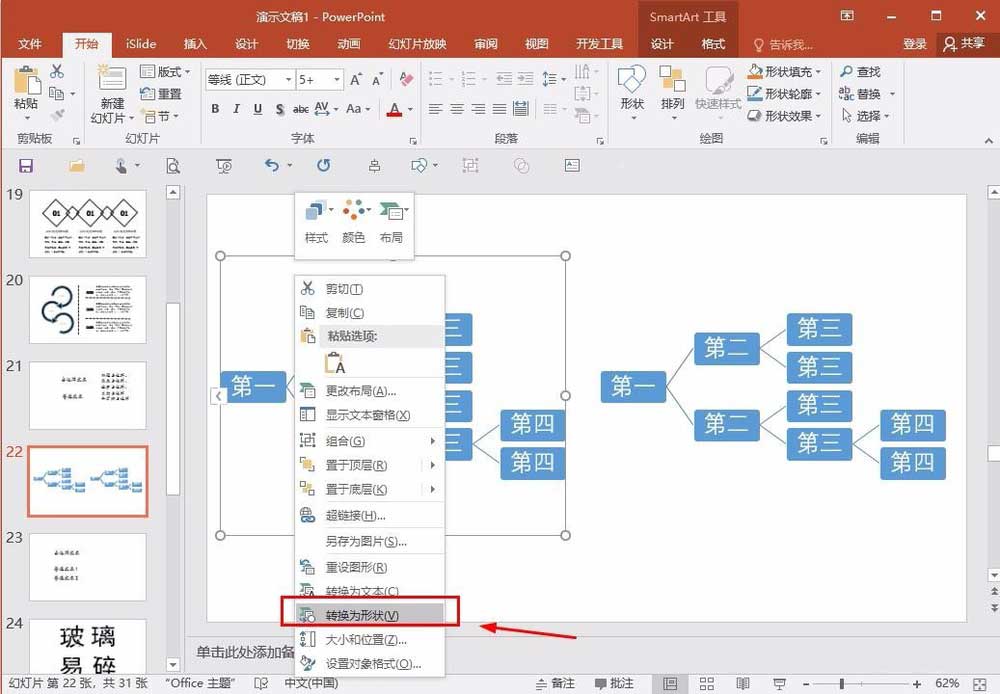 3、方法一:先复制一个SmartArt图形,然后右键,选择转换为形状,这样的话,转换之后,便可以自由上下左右进行旋转,以及翻转了。