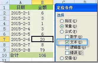 使用SUM求和的结果和手工计算竟然不一致,肯定又是文本型数字搞的鬼。定位条件 - 常量 -文本 让文本型数字马上现出原形。