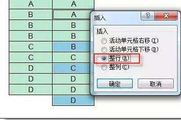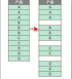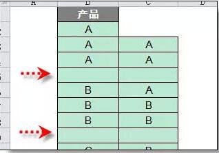 【例】如下图所示的表中,要把在不同的产品之间批量添加空行,效果如图中右侧列所示。