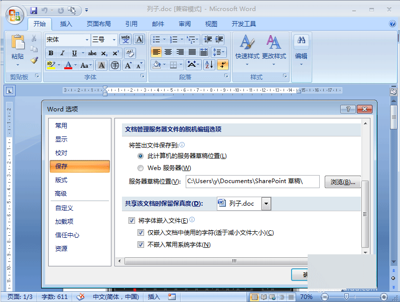 2、点击左侧的”保存“选项,在右侧页面中,点击”将文字嵌入文件”前打勾,并勾选下方的两个选项。之后 ,保存退出,以后该文档就可以在任意电脑上使用,而不会版面错乱了。