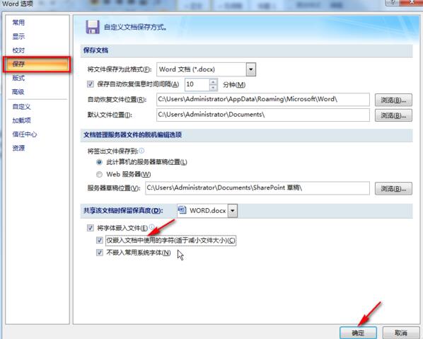 点击”将文字嵌入文件”前打√,并勾选下方的两个选项