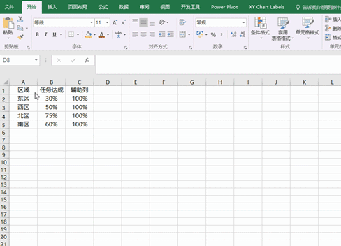 1、数据源准备。数据源中除了百分比数据,还需要一组辅助列,数值均为:100%。