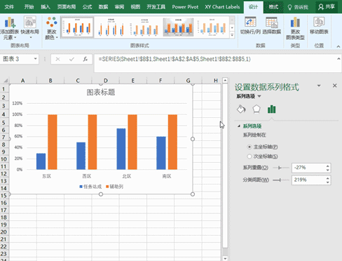 6、合并图表。点击系列选项,在系列重叠里输入100%,然后潇洒的回车(哈哈),两个图表就合并到一起啦。