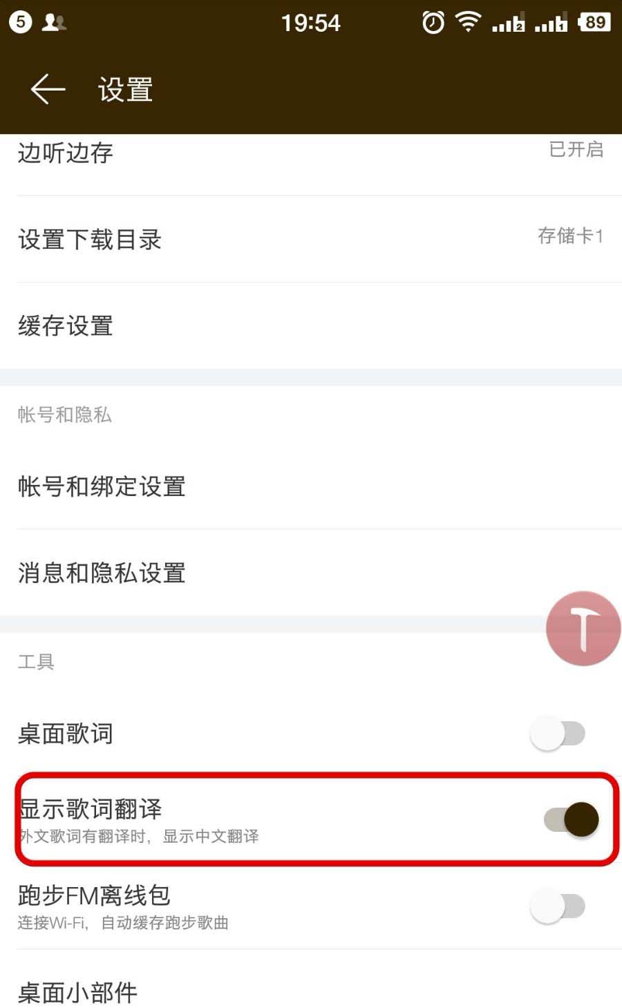 5、进入设置界面后,我们就会看到有一个“显示歌词翻译”有一个自定义开关。