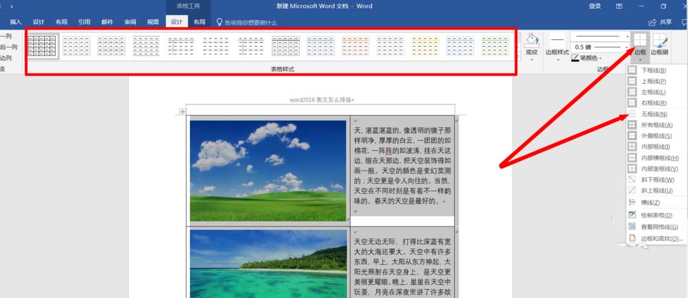 5、选中表格,点击【设计】在红框处选择无框选项,或者点击【边框】然后选择【无框线】即可去掉边框。