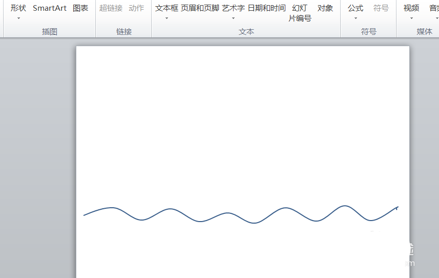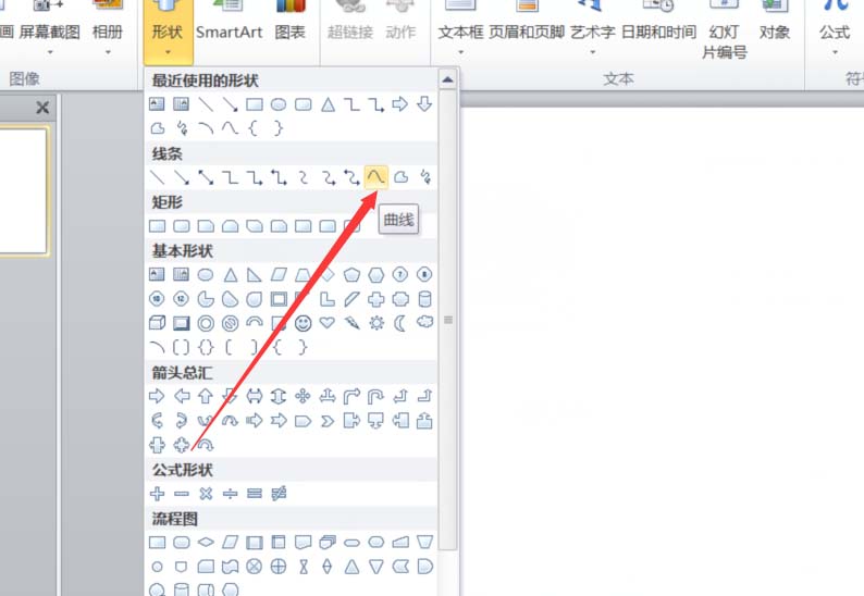 1、打开PPT软件,创建一个新的幻灯片,然后从菜单栏插入一条弧线。
