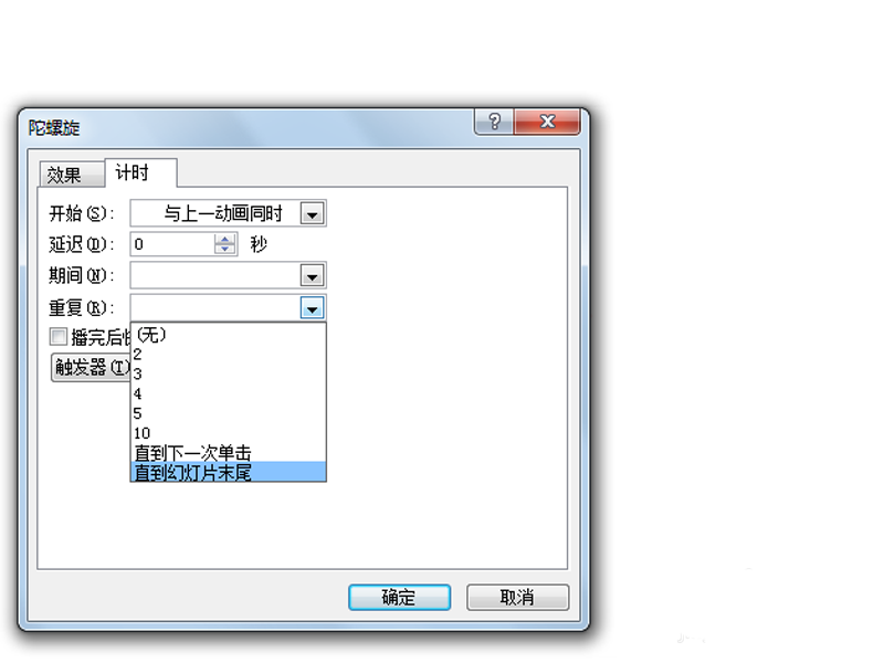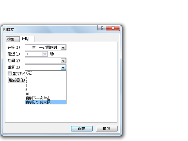 4、执行动画-动画窗格命令,选择所有的动画,调出计时选项卡,设置重复为直到幻灯片末尾。
